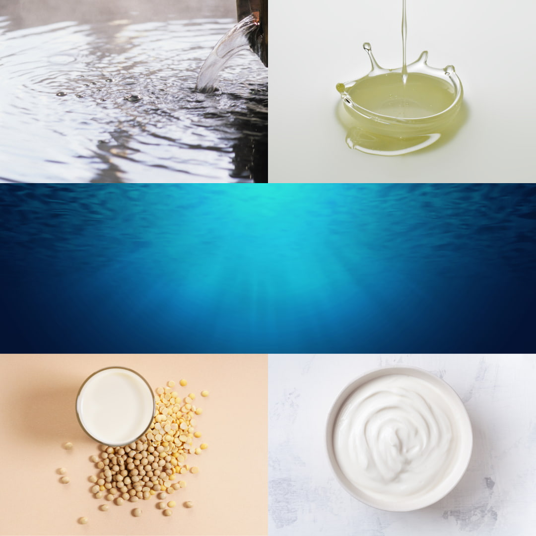 温泉⽔、エミュオイル*¹、⾖乳発酵エキス*²など